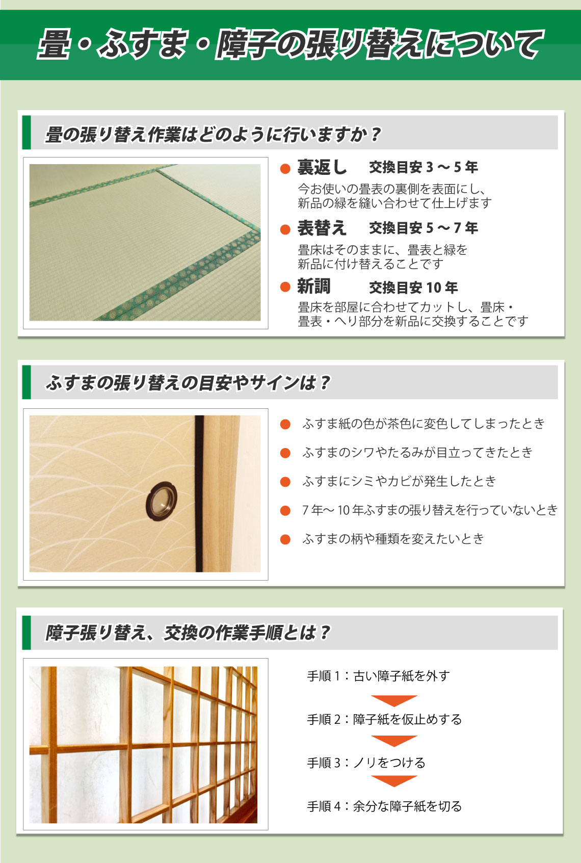 畳・襖・障子は普段からお手入れしていても、残念ながら経年劣化は避けられません。そこで、張り替える目安についても知っておきたいですね。畳は傷、きしみ、日焼けなどの症状がみられるようになります。そのため、3~5年で裏返し、5~7年で表替え、10年で畳替え(新調)を検討してみてください。襖は破れ以外にも、変色やシワなどの症状がわかりやすいですが、7~10年ほど襖の張替えを行っていない場合は張替えをおすすめいたします。障子は紫外線や湿気により徐々に劣化が進むため、特に破れや汚れがなくても5年ごとには張替えをしたいですね。見た目が悪くなくても経年劣化は思わぬところで進んでいるものです。張替えを検討中、張替えについて相談したいといった際は、お気軽にご連絡ください。